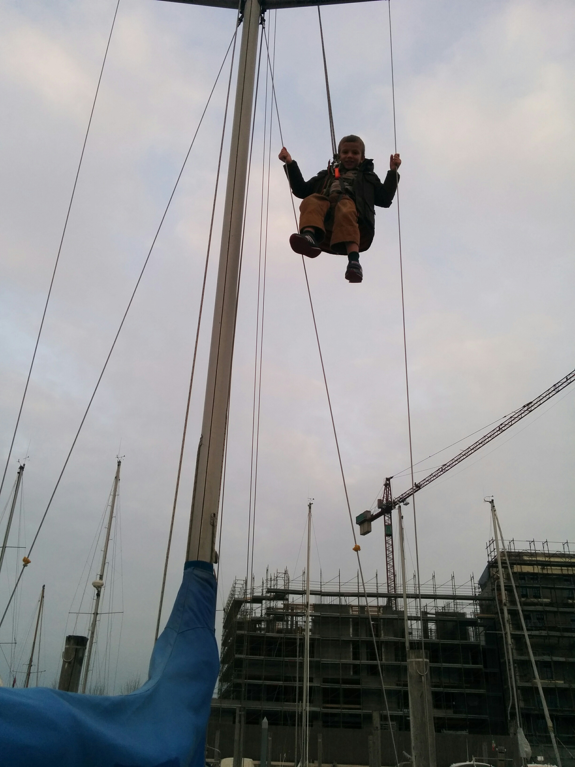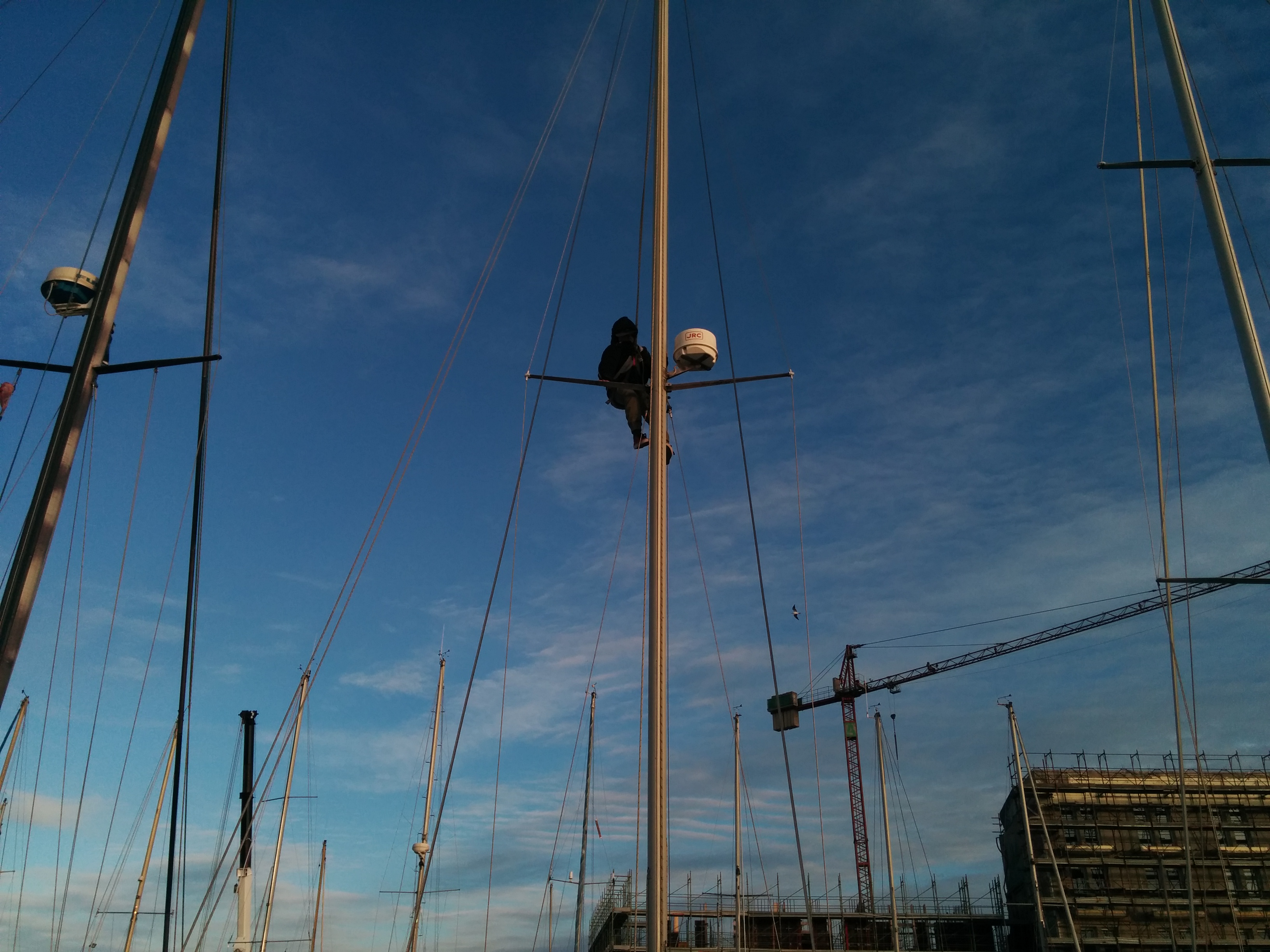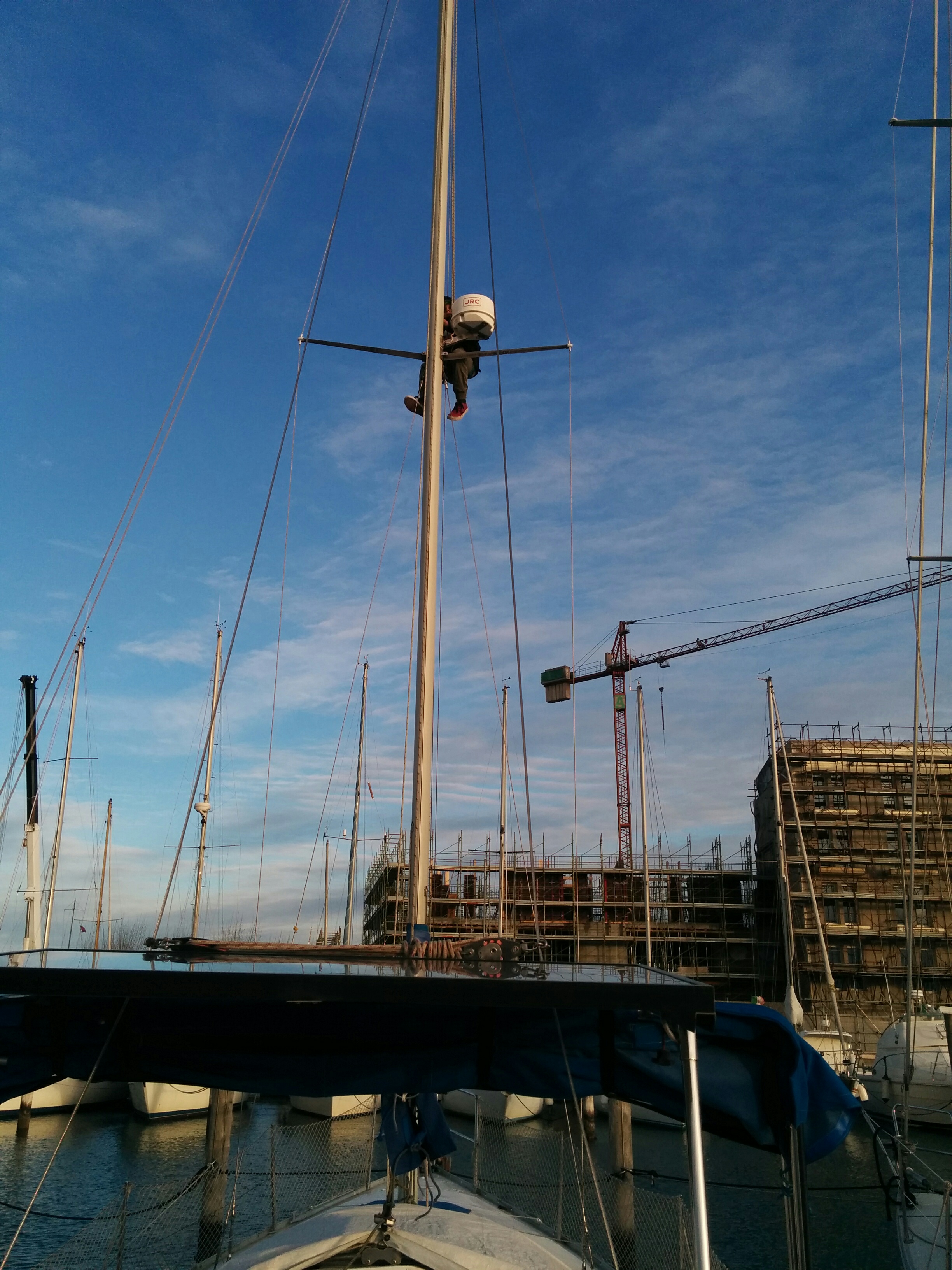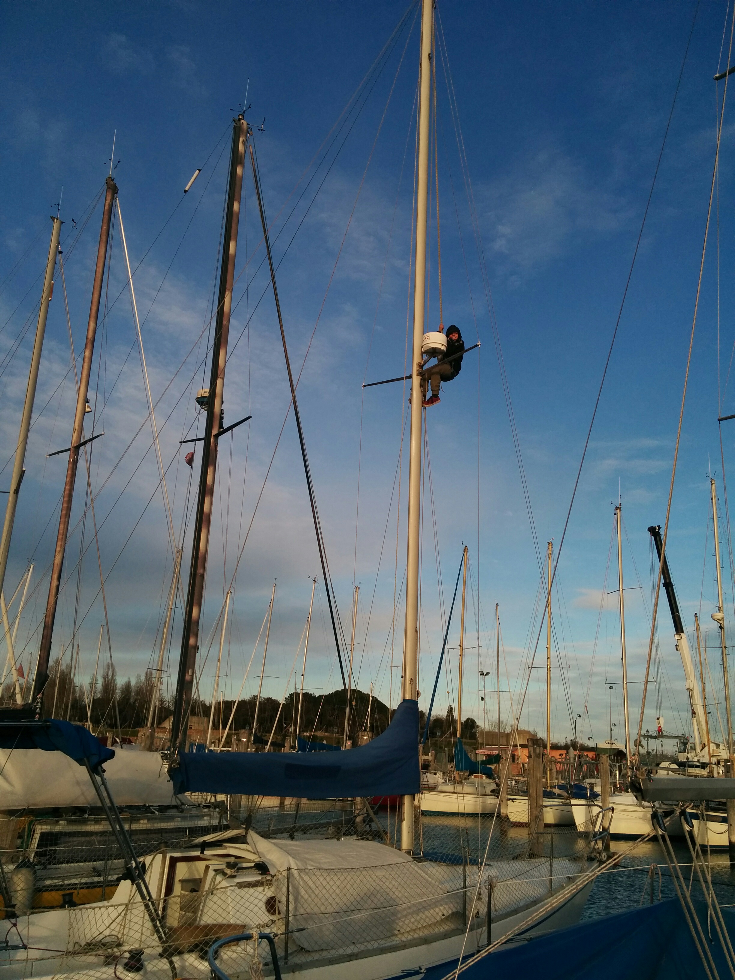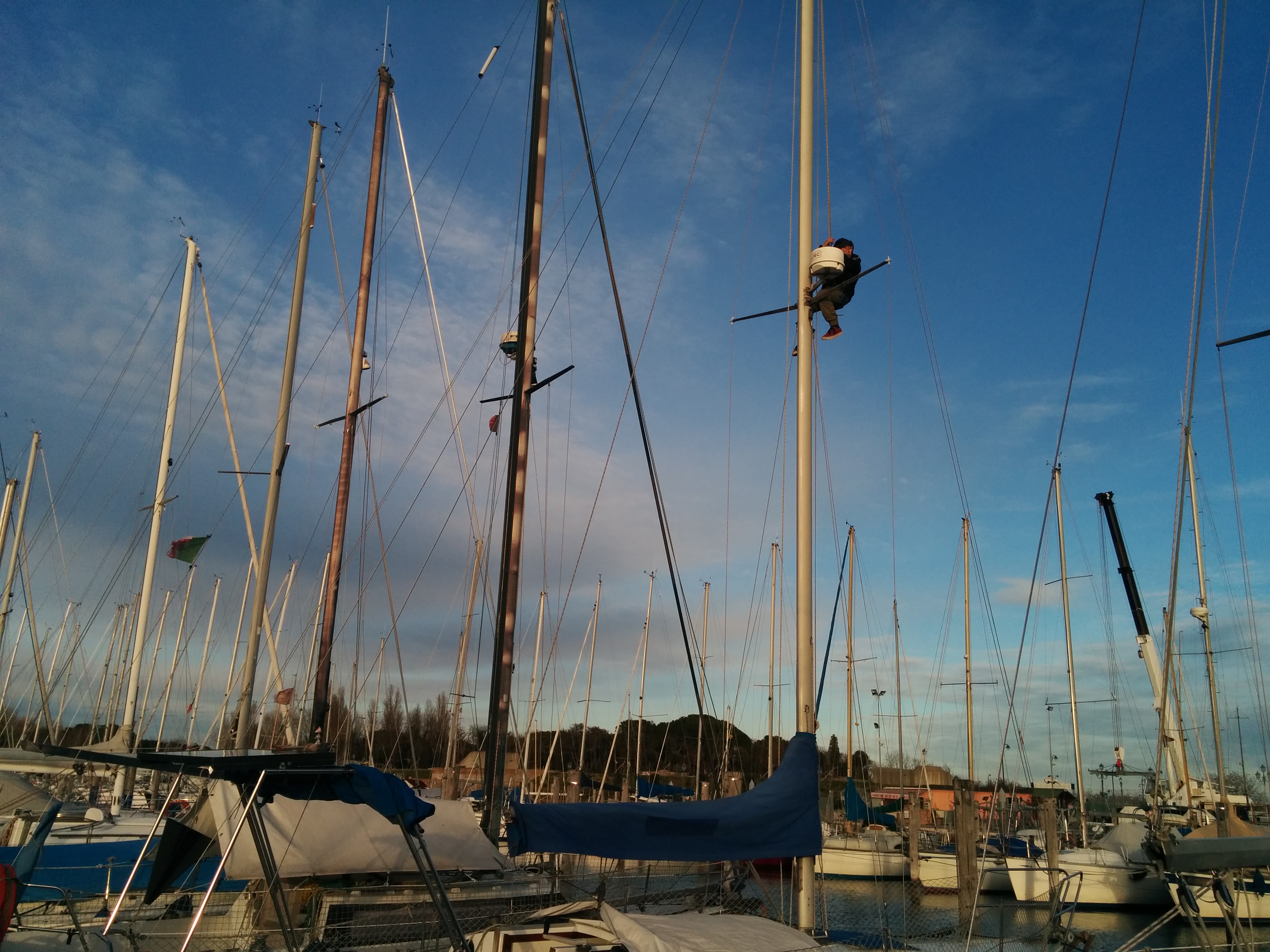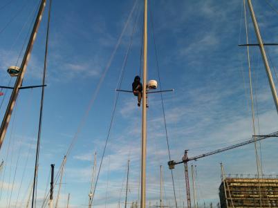 mitigate by pointing to wind with same side (pressure off shrouds on that side) and tied down with a short rope, then pulled down sails and motored back to darsena